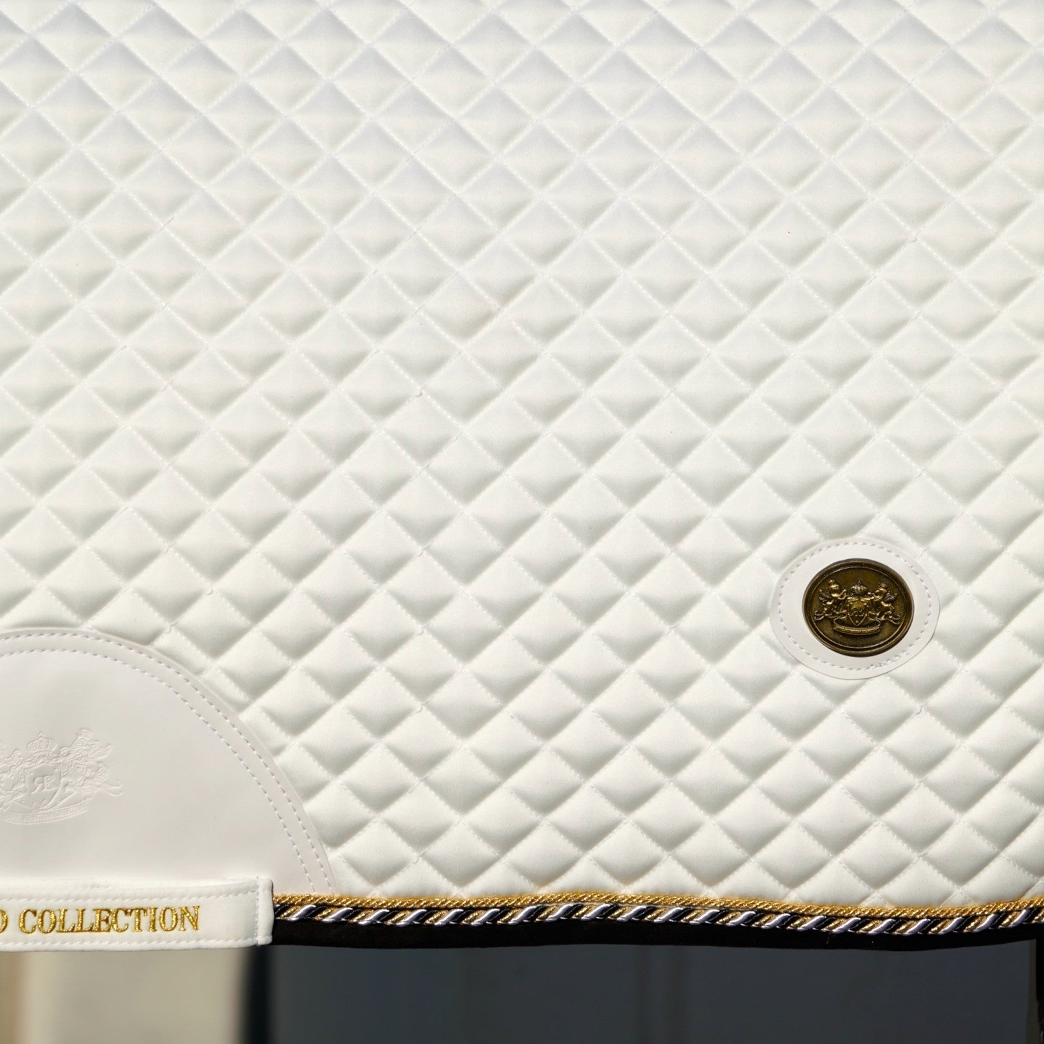 The Royal Equestrian Dressage Saddle Pad White Gold Pro Full blends timeless style with advanced riding comfort. Designed for performance, it stays secure and keeps your horse cool and dry during training or competition.