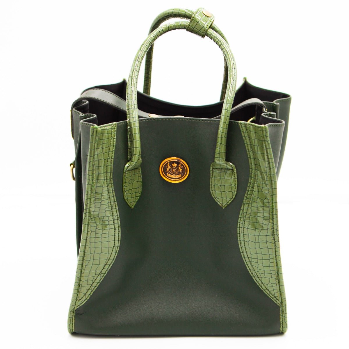 Plejetasken er fremstillet i PU-læder med skinnende krokodille på håndtagene og siderne. Rig på detaljer som messingvåbenskjoldet på en PU-læderholder i midten.