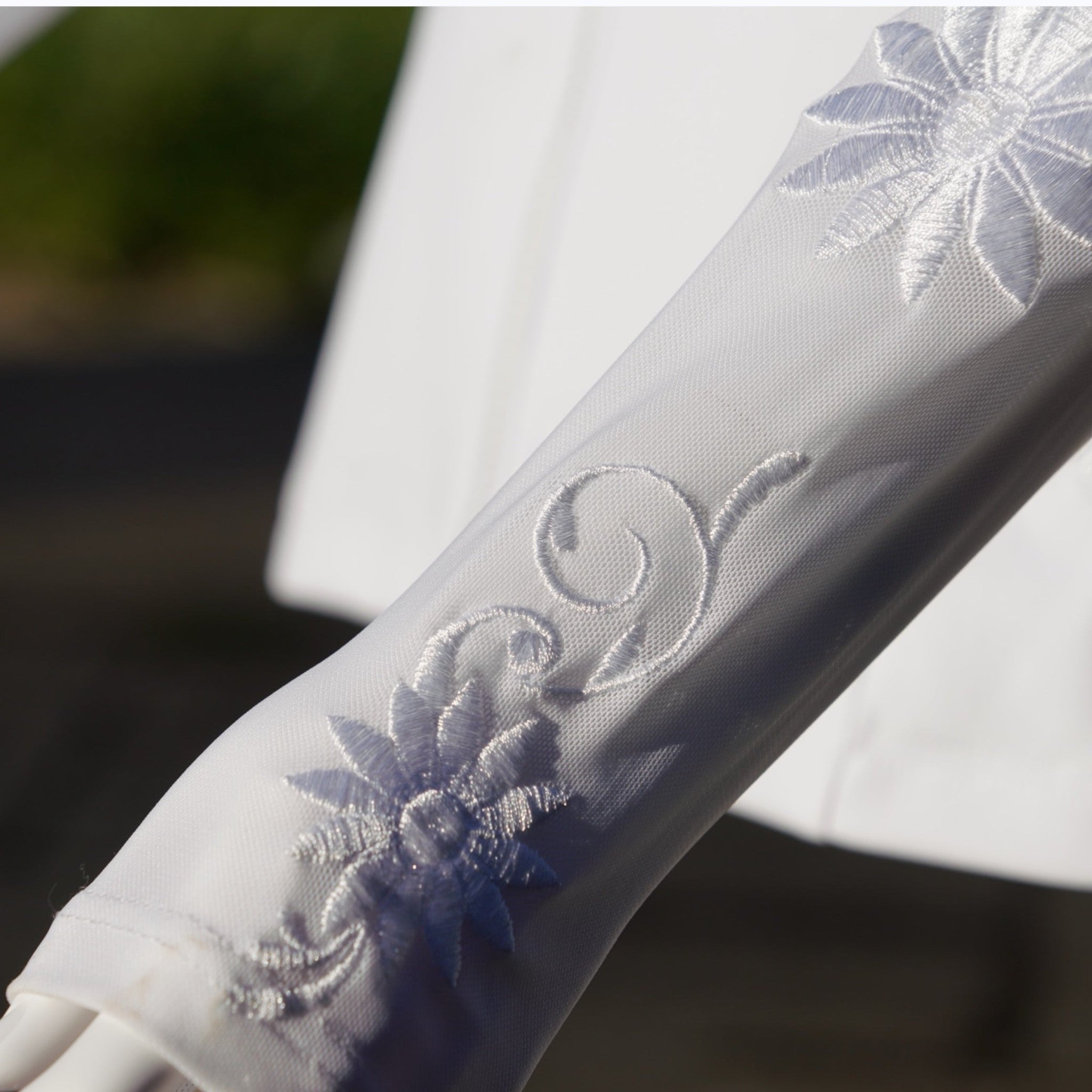 Inspireret af couture-blonderes delikatesse er det øverste panel og skuldrene udført i gennemsigtig blonder, hvilket tilføjer lethed, åndbarhed og dybde, samtidig med at strukturen og beskedenheden bevares. Denne raffinerede gennemsigtighed får broderiet til at se ud, som om det svæver, hvilket fremhæver jakkens æteriske og feminine karakter.