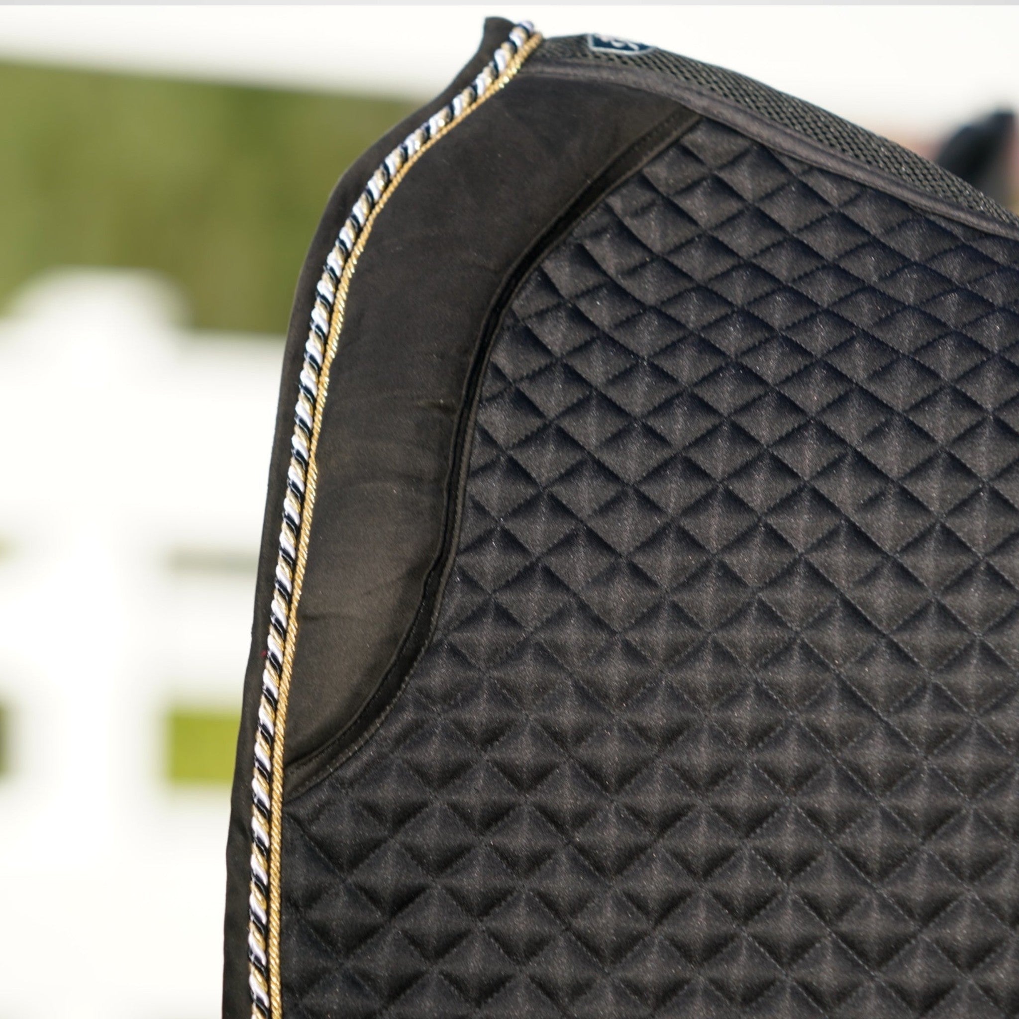 Royal Equestrian Dressage Saddle Pad Black Quilted Full kombinerer elegance, der er klar til arenaen, med avanceret ridekomfort. Desuden er den designet til topydeevne, så den sidder sikkert og holder din hest kølig og tør både under træning og på konkurrencedage.