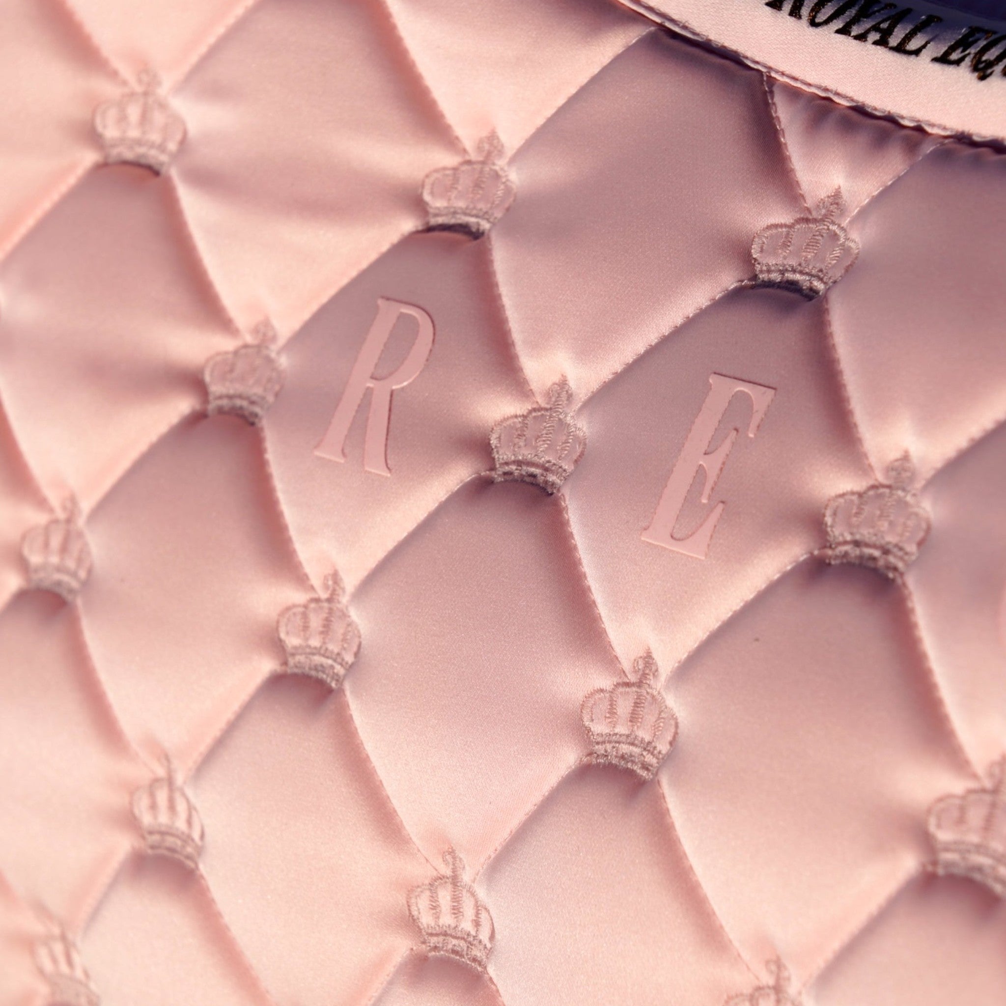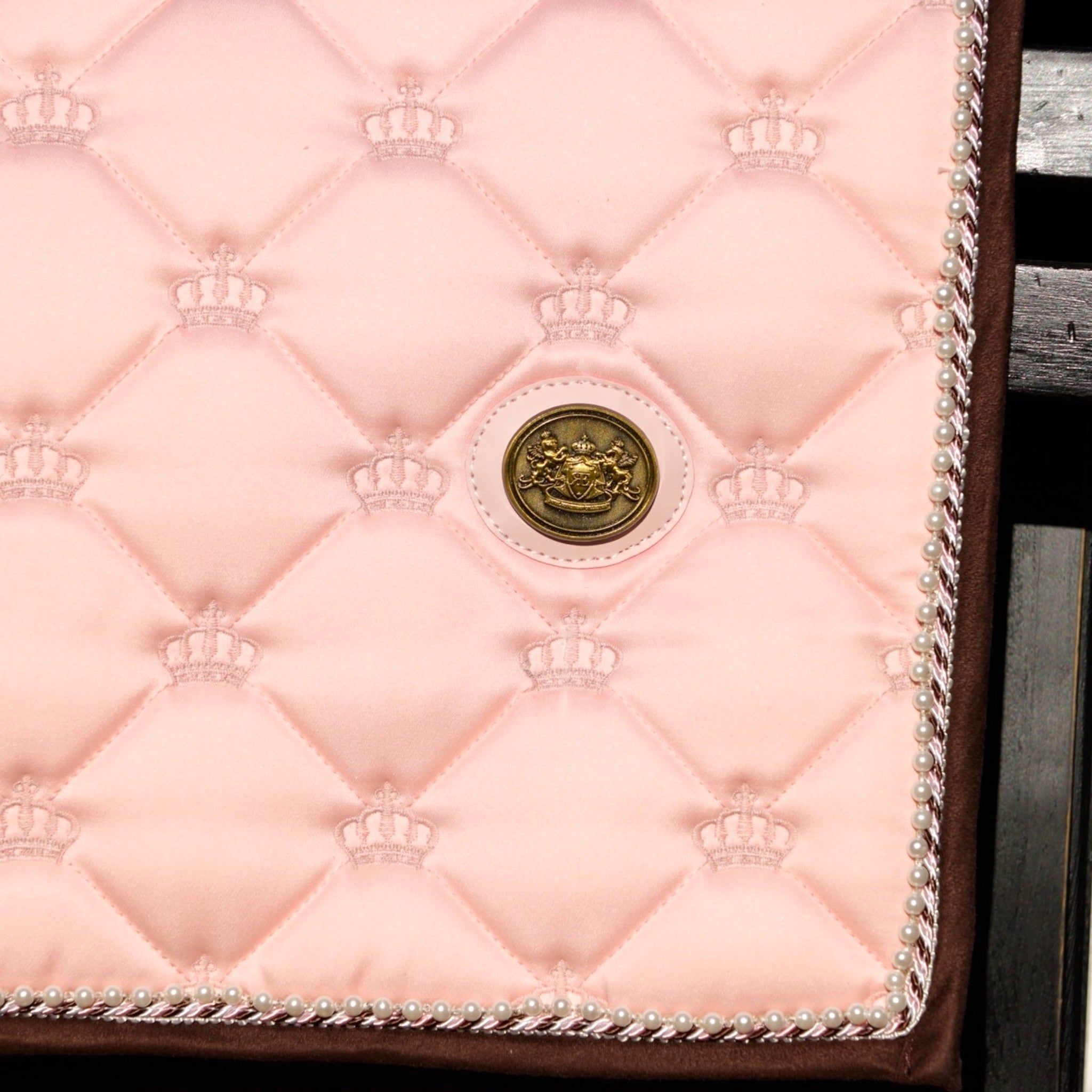 Der Gurtbereich aus PU-Leder ist mit dem königlichen Reitsportwappen geprägt und wird durch den charakteristischen Satin-Gurtriemen mit Verschlussschlaufen ergänzt. Eine Messingplakette auf einer PU-Halterung rundet dieses luxuriöse rosa Dressurpad mit einer eleganten Note ab.