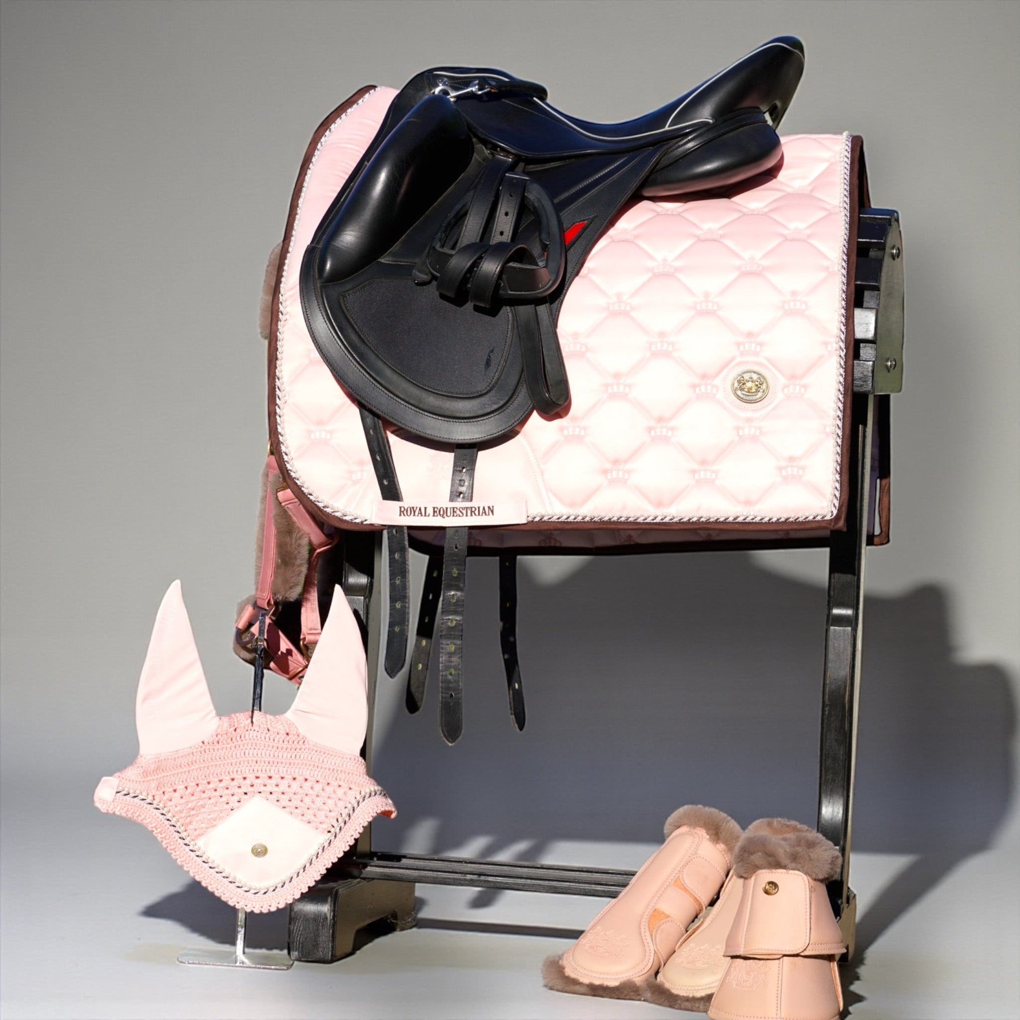 Luxuriöses Oberteil aus Satin in Pastellrosa • kühles, trockenes Futter • feine Nähte • vollständige Füllung • individuelle Wappenembleme • dreifarbige Lurexkordel in Royal Noble auf Wildlederbesatz • zusätzlicher Platz im Widerristbereich • Stoppkissen • schnell trocknende Innenseite • antibakterielle Unterseite • schmutzabweisende Oberseite • hochwertiges Wildleder an Besatz und Block • Limited Edition
