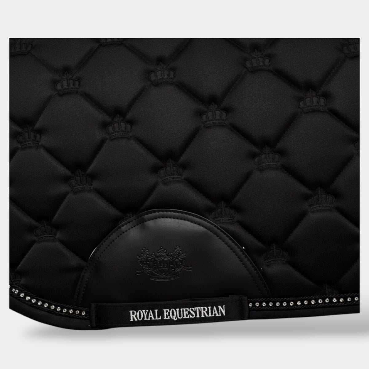 Die Royal Equestrian Jump Show Sattelunterlage Black Crystal verbindet luxuriösen Stil mit Alltagstauglichkeit. Ihr satinschwarzer Stoff mit funkelnden Kristalldetails verleiht dem Training und dem Turnierplatz Eleganz. Gleichzeitig sitzt diese Unterlage sicher und sorgt dafür, dass sich Ihr Pferd bei jedem Sprung wohlfühlt.