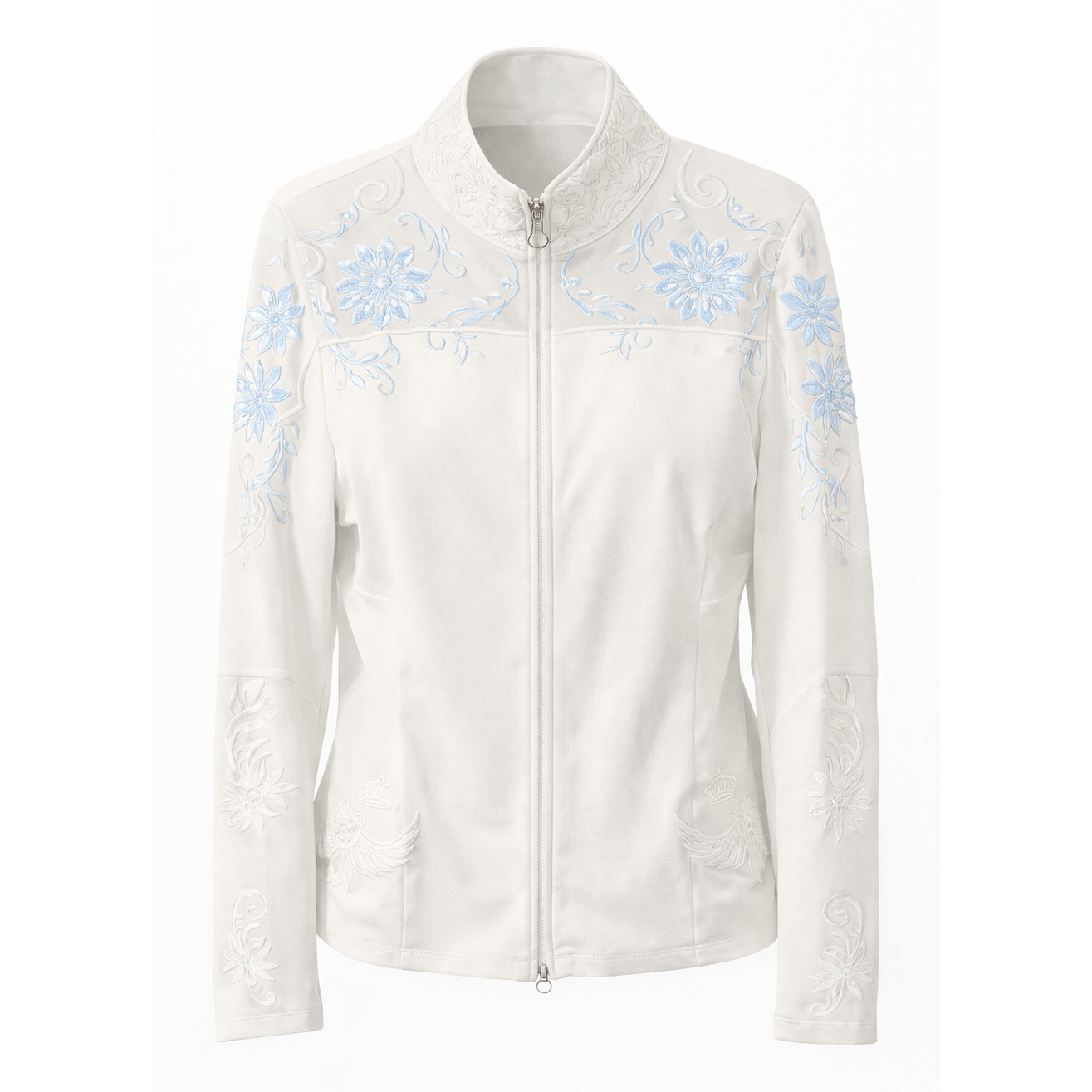 Die Jacke ist in leuchtendem Elfenbein gehalten und mit einer exklusiven Haute-Couture-Blumenstickerei in zarten Eisblautönen verziert. Jede Blume wurde individuell entworfen und von Hand aufgebracht, inspiriert von gefrorenen nordischen Blüten und arktischem Licht. Die Stickerei ziert die Schultern, den oberen Brustbereich, die Ärmel und die Manschetten und bildet einen anmutigen Kontrast, der auf dem elfenbeinfarbenen Grund fast wie von Frost geküsst wirkt.