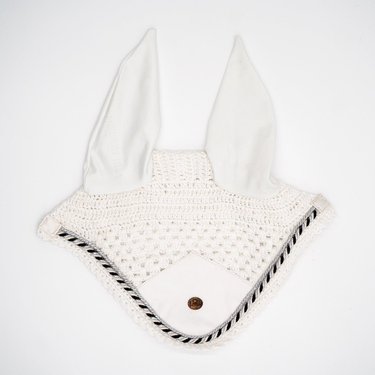 El gorro Royal Equestrian Signature Ear Bonnet en color blanco plateado está fabricado a mano con un tejido de ganchillo de tres capas de primera calidad, con una lujosa pieza frontal de satén y orejas de licra elástica suave con el logotipo de Royal Equestrian.