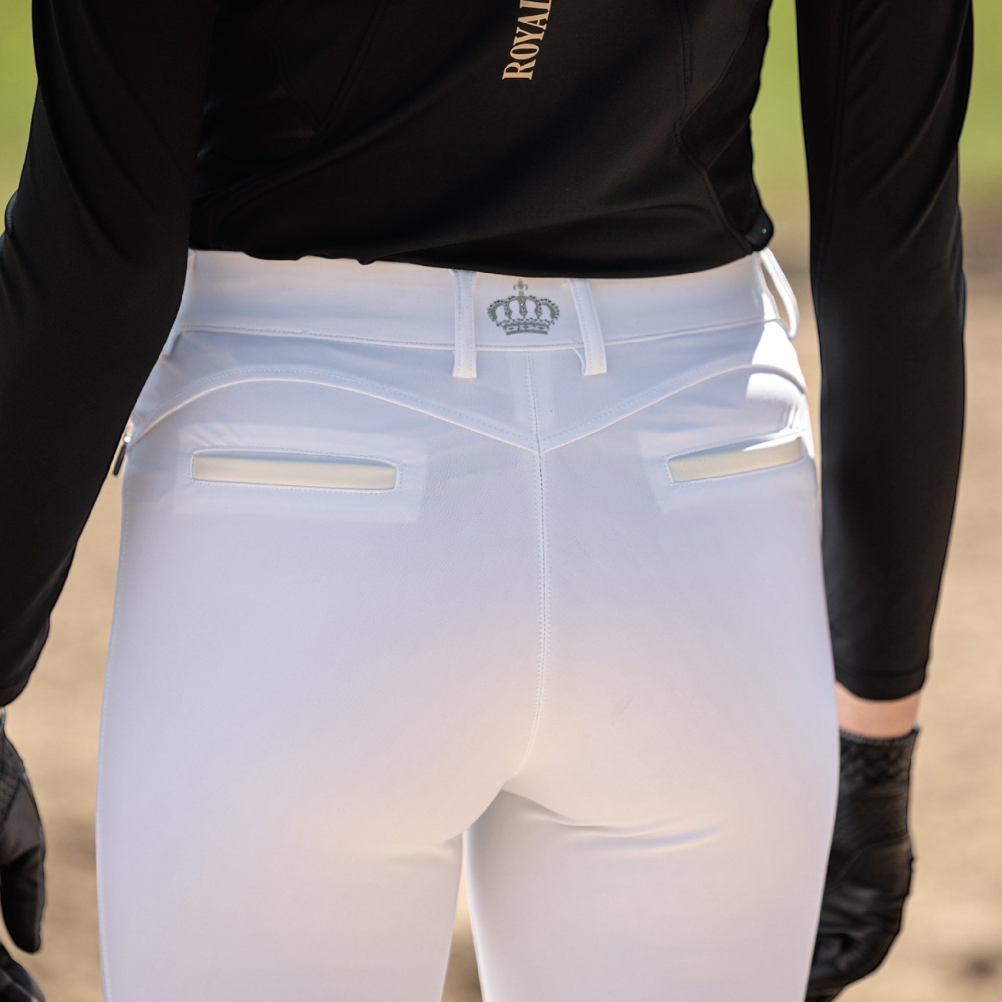 Chaque paire est élégamment décorée d'accents Swarovski sur le côté de la jambe extérieure. L'écriture scintillante "Royal Equestrian" ajoute une touche subtile mais luxueuse de glamour.
