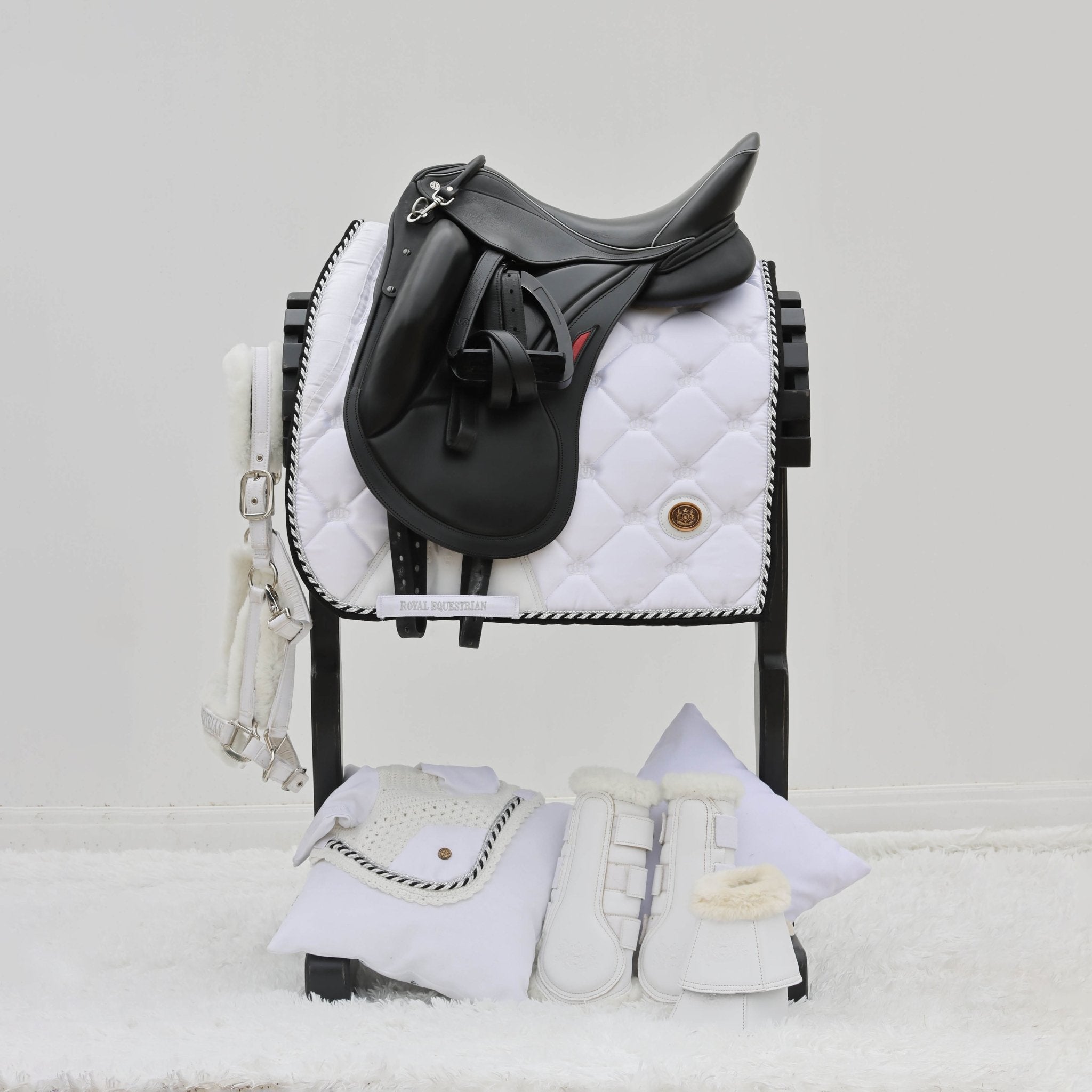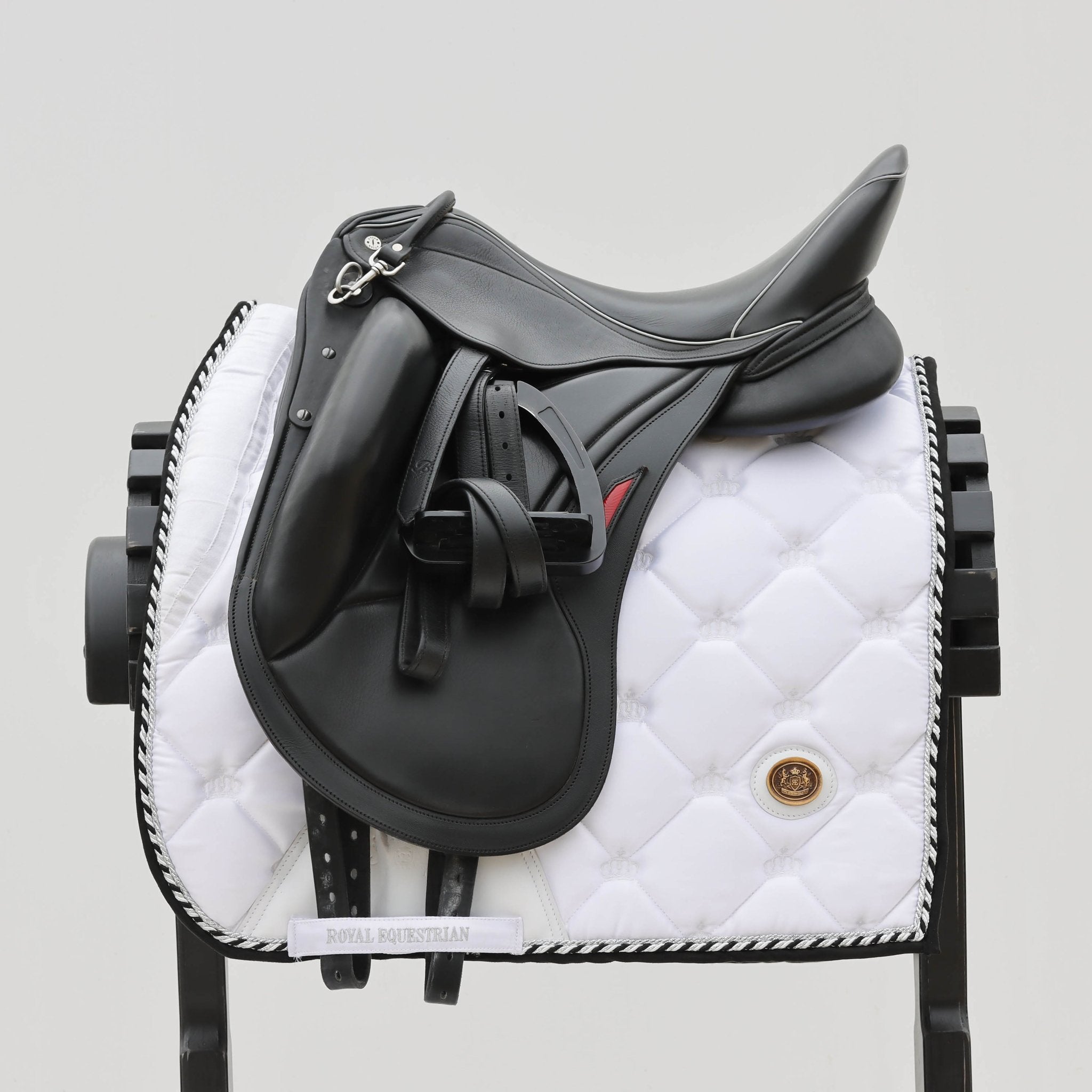 Il sottosella da dressage Royal Equestrian White Silver Full combina un'eleganza senza tempo con un comfort di guida superiore. Realizzato per garantire prestazioni ottimali, rimane ben saldo e mantiene il cavallo fresco e asciutto sia durante l'allenamento che durante la competizione.