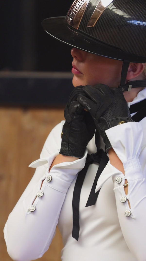 "Het Brenda Wedstrijdshirt is gewoonweg prachtig - elegant ruches, ademende stof en een perfecte pasvorm. Ik voel me zelfverzekerd en klassiek in de ring!"