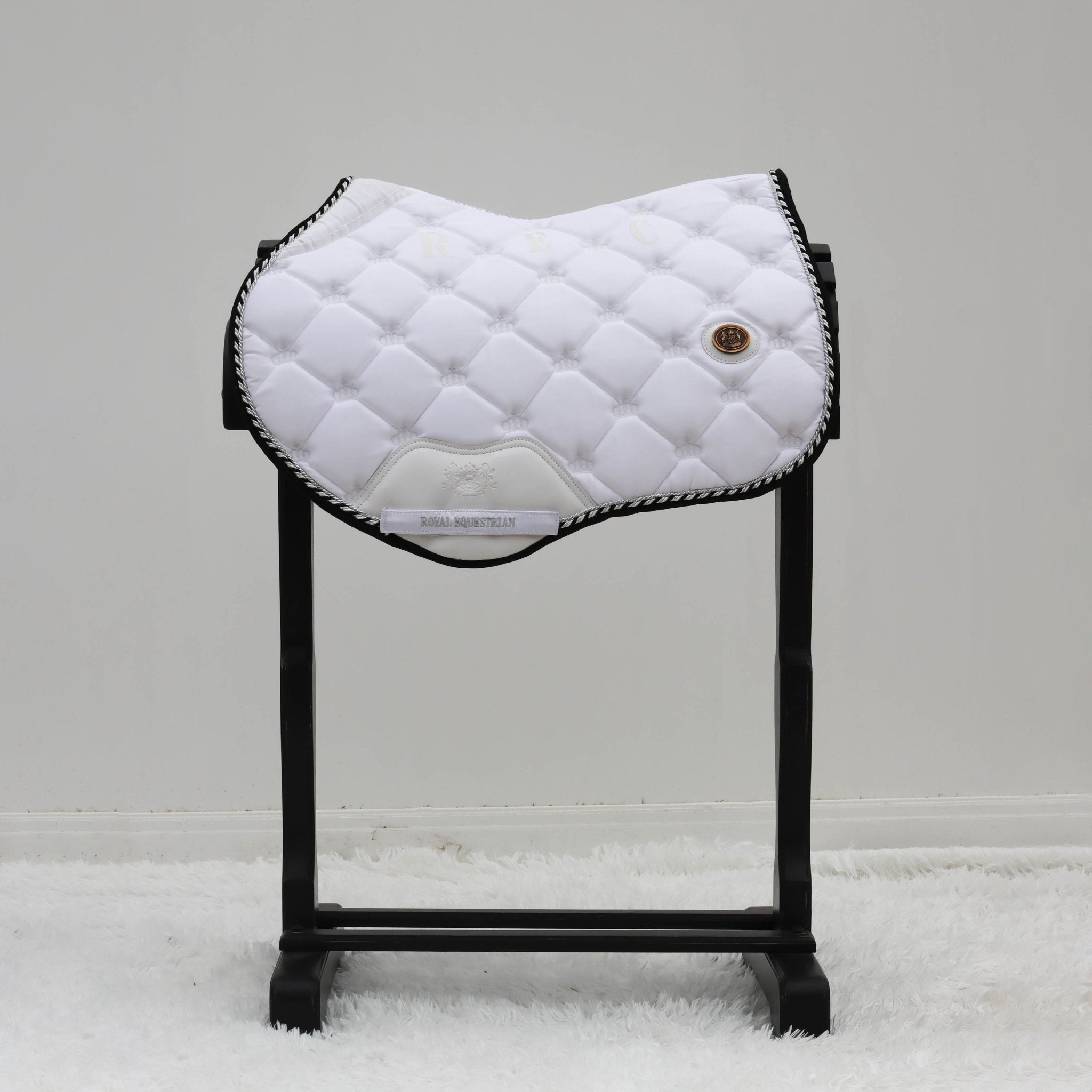 Het Royal Equestrian Jump Saddle Pad White Silver combineert verfijnde elegantie met professionele prestaties. Het frisse witte satijnen bovenwerk, gecombineerd met strakke zilveren accenten, zorgt voor een opvallende look tijdens zowel trainingen als wedstrijden. Dit springzadeldek is ontworpen voor stabiliteit en comfort en zorgt voor een stevige pasvorm en uitstekende ondersteuning voor paard en ruiter.