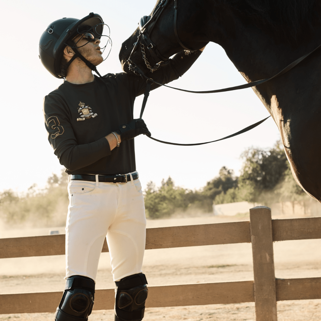 Het shirt is gemaakt met een focus op mobiliteit en een gepolijste esthetiek en heeft lange mouwen en een relaxte pasvorm. Het is elegant versierd met het prestigieuze "Royal Equestrian Polo" logo geborduurd op de linkerkant van de borst. De achterkant maakt een opvallend statement met het nummer 3 en de samen geborduurde polohamers, die het erfgoed en de dynamische aard van de sport symboliseren.