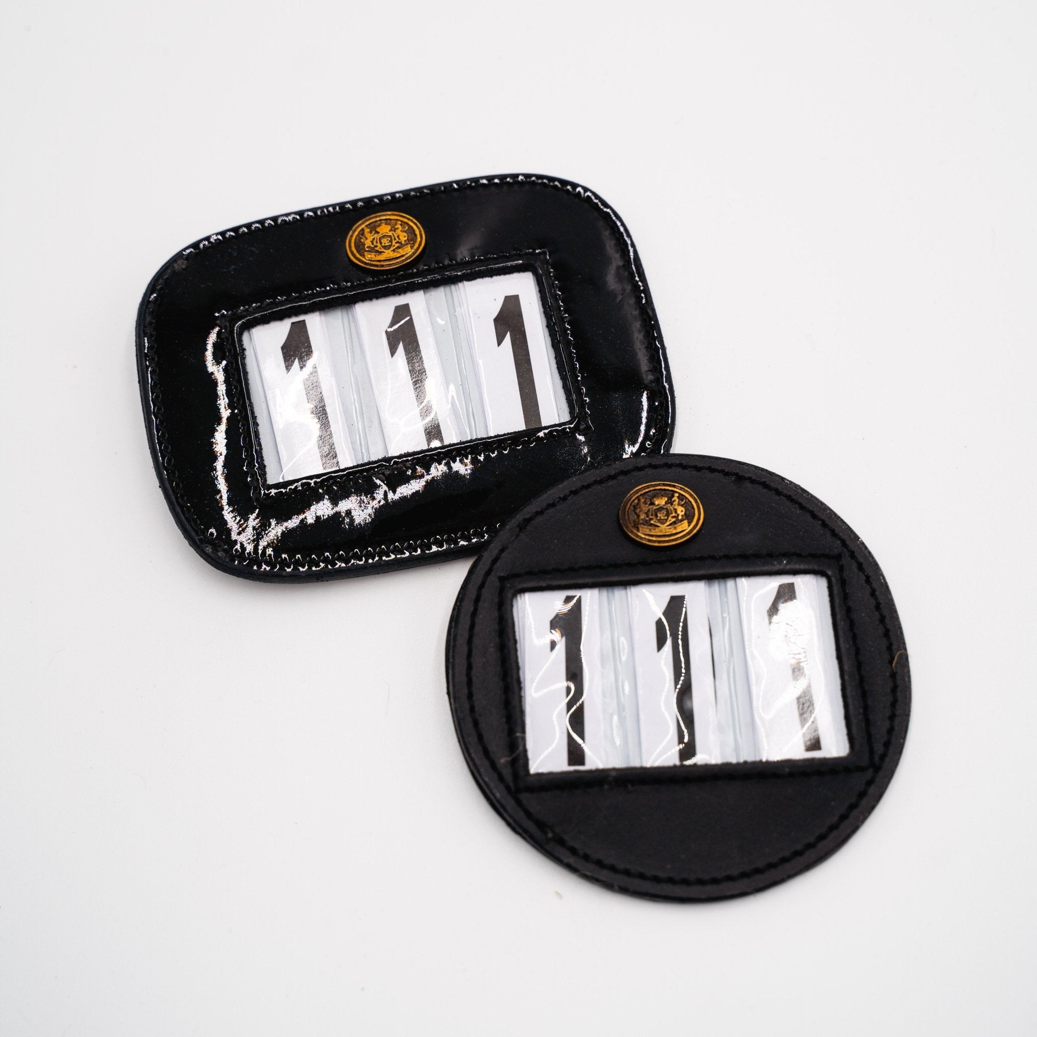 Royal Equestrian nummerholder i svart lær kommer i både en firkantet og en rund variant, hver med 3 mellomrom for å tillate enhver kombinasjon av tall på 3 sifre.