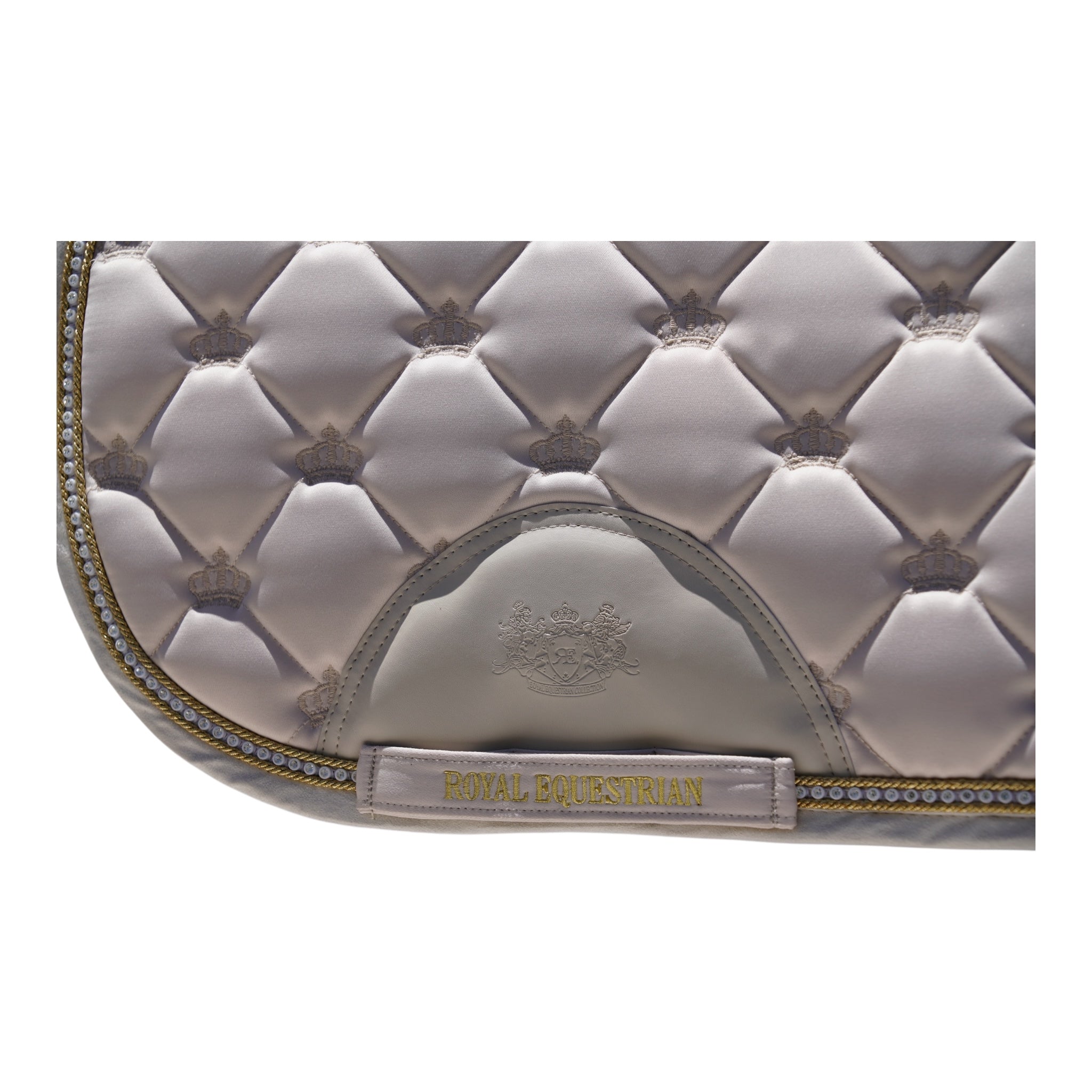 Podkładka pod siodło Royal Equestrian Jump Saddle Pad Crystal Champagne Full łączy w sobie ponadczasową elegancję i niezawodną funkcjonalność. Dzięki miękkiemu satynowemu wykończeniu w kolorze szampana, kryształowym akcentom i delikatnemu pikowaniu, podkładka ta doskonale sprawdzi się zarówno podczas treningów, jak i zawodów.