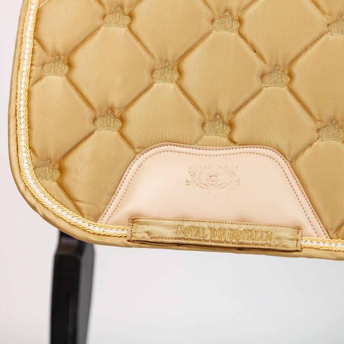 Luksusowa satynowa górna część w kolorze szampana • kryształowe wykończenie • chłodna, sucha podszewka • delikatne szwy • pełne wypełnienie • niestandardowe emblematy herbu • 3-kolorowy sznur lureksowy Royal Noble na zamszowym wykończeniu • dodatkowa przestrzeń na kłąb • poduszki zatrzymujące • szybkoschnąca strona wewnętrzna • antybakteryjna strona zewnętrzna • odporna na zabrudzenia strona górna • wysokiej jakości zamsz na wykończeniu i bloku • edycja limitowana
