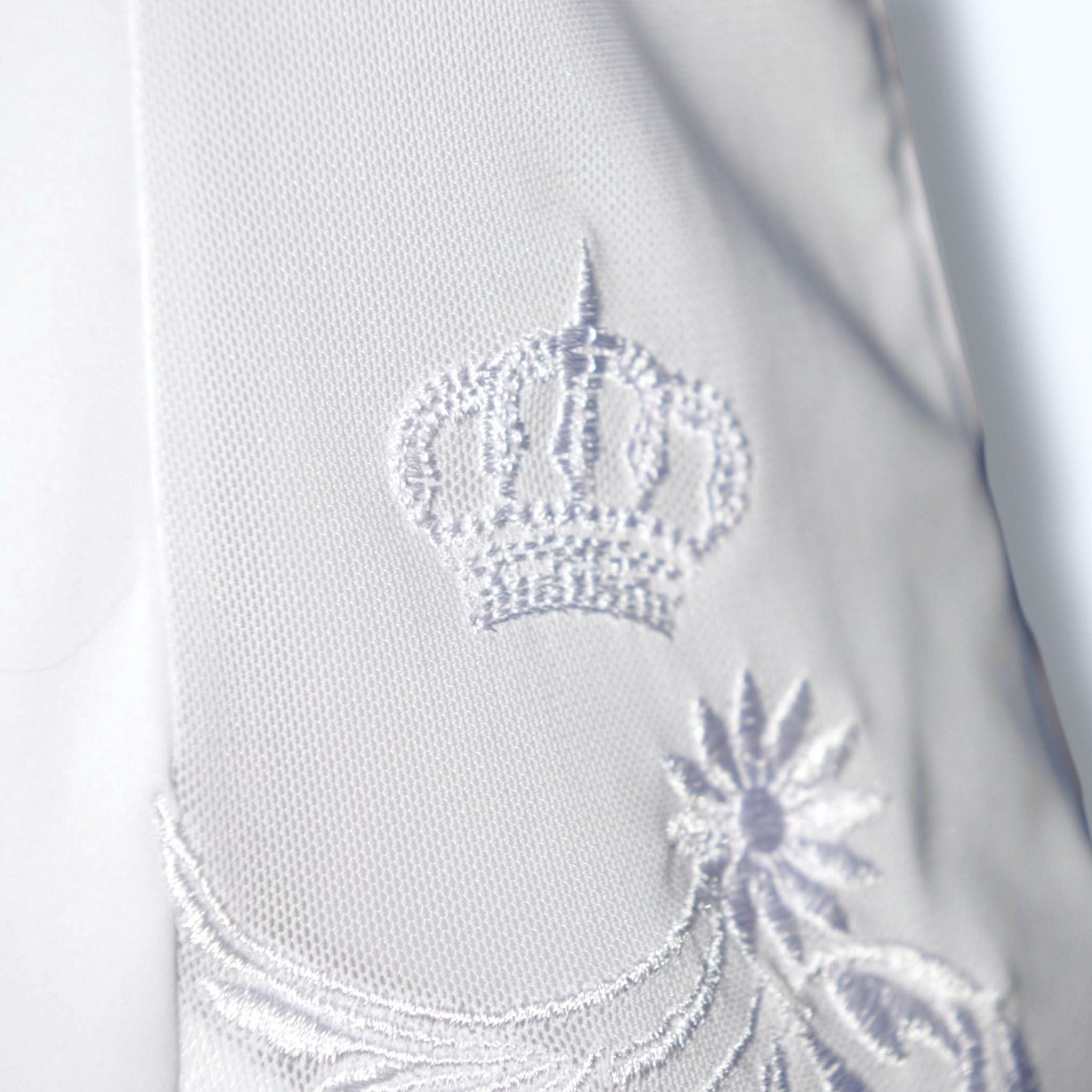 Inspired by the delicacy of couture lace, the upper panel and shoulders feature a sheer lace construction, adding lightness, breathability, and depth while maintaining structure and modesty. This refined transparency allows the embroidery to appear as if it is floating, enhancing the ethereal and feminine character of the jacket.