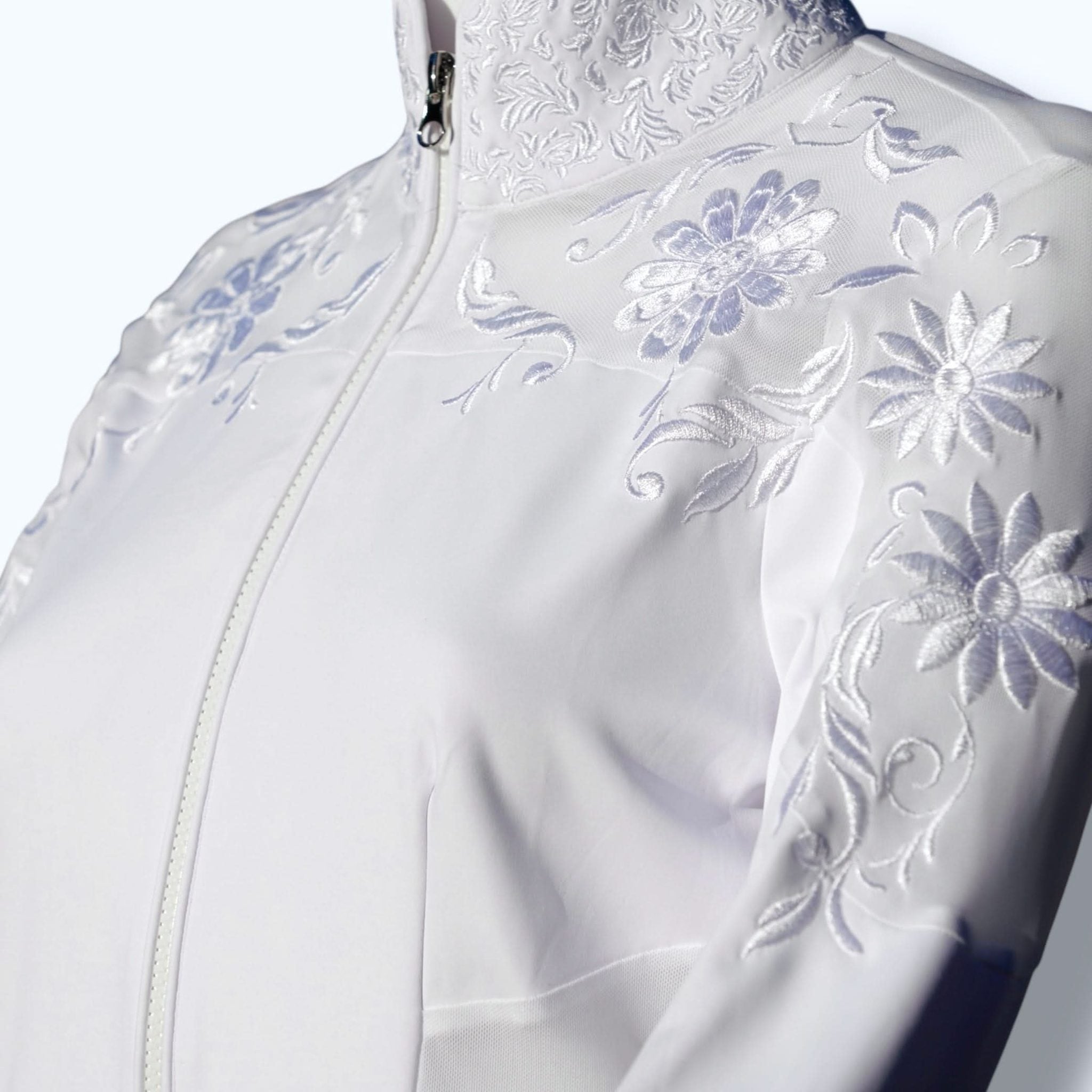 Crafted in luminous ivory, the jacket is elevated with custom haute couture floral embroidery inspired by frozen Nordic blooms. Each embroidered flower is individually designed and placed, creating a sculptural composition that flows across the shoulders, upper chest, sleeves, and cuffs, forming a soft yet powerful silhouette.
